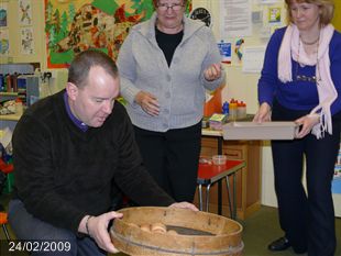 As is the custom in Shepton each child brought an egg to school this morning for our traditional “Shackling Eggs”. No one seems to know quite when this custom started, it certainly goes back more than a hundred years in our village and also in Stoke St Gregory. Eggs were used up before the start of lent on Ash Wednesday, but why they should be shackled in a sieve to find which one lasts the longest, without being cracked remains a mystery. A small prize given to the owner of the winning egg from each class, as usual donated by the Robins Trust. Wikipedia Article on Egg Tapping